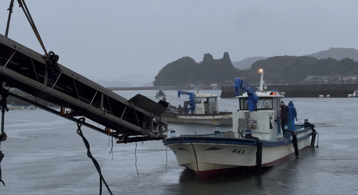 今日の虫明の天候は、カキにとっては恵みとなる、雨降りでした。