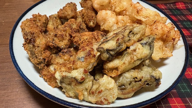今日は、牡蠣フライ牡蠣の天ぷらを作ってみました!(海老てんぷらを添えて)笑