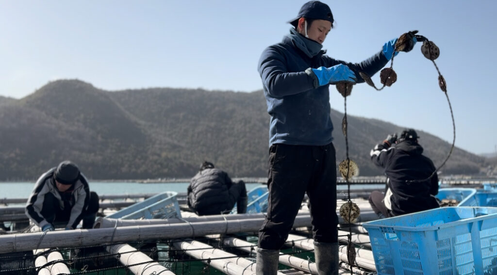 牡蠣の産卵時期になると、産卵された卵が海中を浮遊し、のんびり穏やかな波に揺られながら帆立の殻にくっつきます。