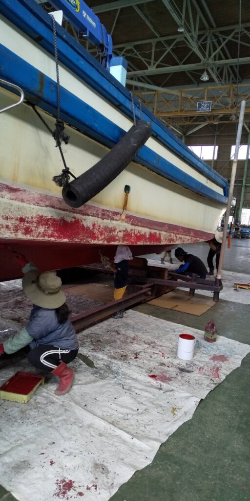 みなさん、日本酒を瓶ごと海の筏に吊るして